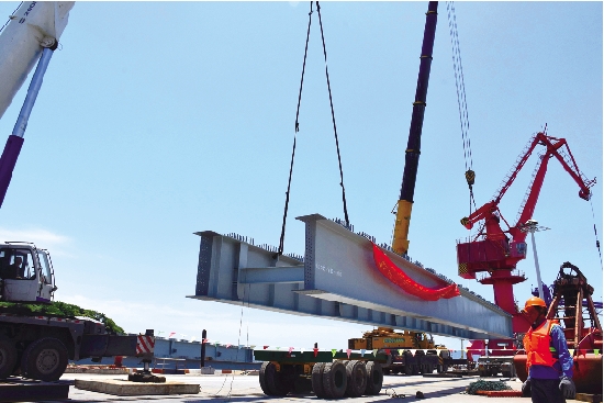 经过5个多小时的装卸,首批钢板梁装卸完毕,等待转运到施工现场。