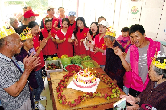 6月15日,城北街道敬老院内,城南镇星光志愿者协会的志愿者们为两位超过85岁的孤寡老人庆祝生日。他们还为其他老人洗脚、剪发、洗头、修剪指甲、包饺子等。