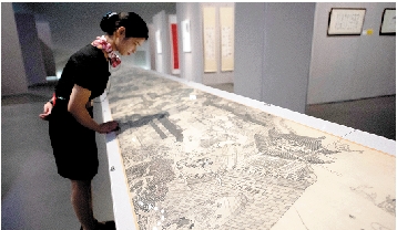 6月19日下午,温岭博物馆内,工作人员正在仔细欣赏温岭版画家袁振璜创作的《太平春秋图》。画卷长20米,是袁振璜用时两年多的精品力作,展现明末清初温岭的民俗风情,被称为“温岭版的《清明上河图》”。现场同时展出了陈曼声、张直生、郭修琳、陈野林、毛孝弢等5位书画艺术家的精品作品60幅。本报记者 朱海伟摄