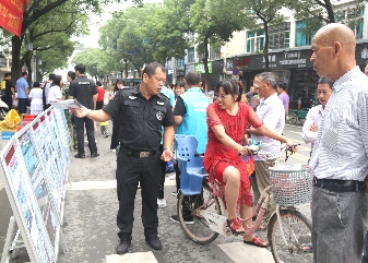 当天是集市日,振兴中路上群众来往较多,宣传点迅速吸引了一批群众驻足观看。工作人员布置了安全知识展板,并安排人员为群众讲解展板内容,同时解答有关防诈骗、安全生产、禁毒、消防安全等法律法规问题,并向过往群众发放相关安全知识宣传资料。