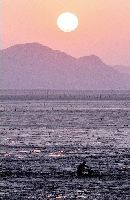 日暮时分,一轮火球投向远山的怀抱,劳作了一天的讨海人推着满载的“滑板车”归去。讨海,寓意“向海讨生活”,先民们畏惧海之神威,但为生活所迫不得不靠海吃海。今天,这些讨海人依然早出晚归,辛辛苦苦只为维持生计。照片中红日、滩涂与讨海归来的渔民,在此刻组成了一幅美丽的讨海归来的画面。
