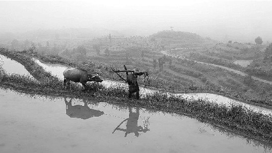 春天一到,最早忙碌的地方就是稻田里。沉睡许久的泥土又要再一次被翻起耙平,为后续的播种插秧打好基础。照片中,一个农民牵着自己的水牛在田埂上低头赶路,稻田里的积水倒映出他们的影子,远处则是当地层层的梯田。当下,看惯了大型机器在稻田里耕地、播种、收割等机械化的场景,再来看田园里的水牛耕耘,一定别有一番情趣。