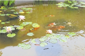 这几天,鱼池内的几盆睡莲盛开,鱼儿时不时游到水面上,张嘴想咬一咬莲叶,却都不能如愿。“鱼戏莲叶间”,陈娇地站在鱼池旁,每每看到这样的场景都很开心。为了让鱼池里的水保持干净,黄立均用玻璃粘拼成了一个四格过滤装置,格子里放上海绵,用来过滤水中的脏东西。