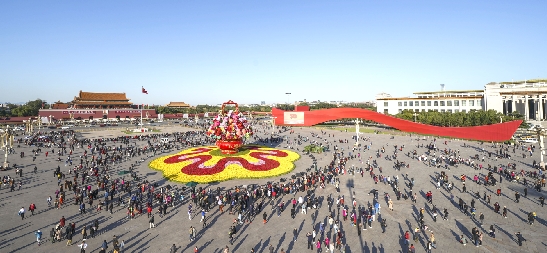 10月14日,以“花果篮”为主造型的天安门广场中心花坛吸引了众多游客参观拍照。“花果篮”的夜景更是流光溢彩,绚烂迷人。
