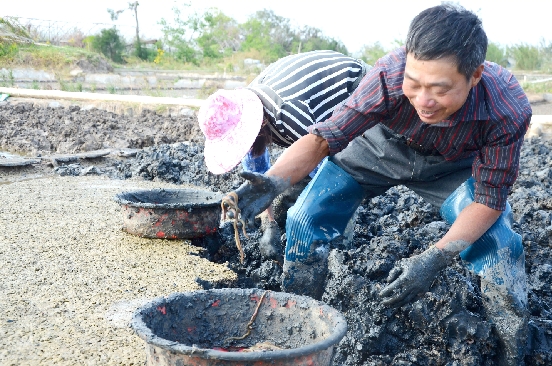 连日来,在滨海镇五一塘、团结塘边的养殖场里,养殖户们正在淤泥里翻挖海沙蚕。