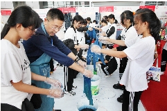 学生体验非物质文化遗产蓝印花布制作。