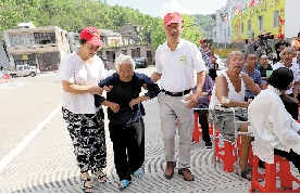 松门义工队送文艺进敬老院,义工们搀扶着老人去看演出。