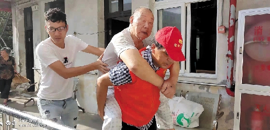 松门敬老院搬迁,松门义工队副队长叶友富背着老人去新的敬老院。 (本版部分图片由受访者提供)