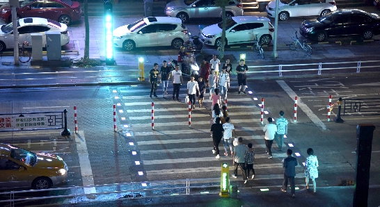 到了晚上,斑马线四周的地砖灯还可以起到更为明显的提示作用。有人要过斑马线,LED感应柱自动亮起,发光地砖频闪,提醒驾驶员注意停车避让行人,语音播报同时响起。行人离开斑马线后,感应灯自动熄灭,发光地砖停止频闪。