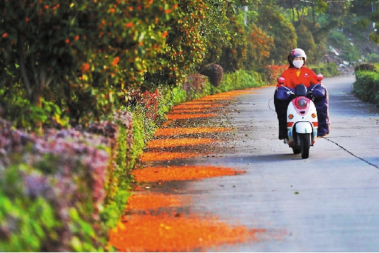 这张照片拍摄于城南镇横溪村,骑行在满地桂花的路上,真可谓是“一路芳香”。全市各地种植了很多桂花树,这个季节温度适宜,满城飘香,正适合外出散步。