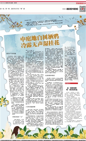 一到丹桂飘香的时节,朋友圈总是被满满的桂花刷屏。网友“果汁”的孩子说:“秋天的温岭,有两个世界。一个叫家,一个叫桂花香。”在孩子的世界里,桂花美美的、香香的、甜甜的,是家乡的味道。只要有家的地方就有桂花香,有桂花香的地方就有温馨。