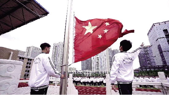 国庆节前夕,市实验学校城东校区开展了“少年意气发,携手庆华诞”迎国庆系列主题活动。学校与城东街道武装部联合开展了“国防教育进校园”活动,组织七、八年级学生进行武术操表演,并组织全校师生参与环九龙湖健康跑活动,为增强学生体魄打好基础。图为学校举行升旗仪式,全体师生面向国旗庄严宣誓。