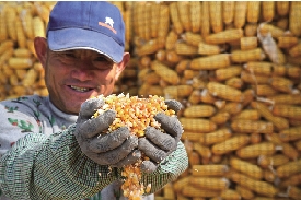 10月19日,青岛莱西市夏格庄镇官庄村村民褚言说,今年玉米颗粒饱满,能卖个好价钱。