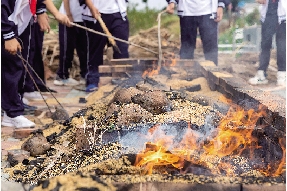 在吃烤番薯的过程中,细心的学生发现了土灶里的“秘密”,开始向老师提问:“这些黄色的是谷糠吗?为什么要把谷糠覆盖在土灶上?”原来,谷糠不易散热,当柴火点着后,再把谷糠撒在上面,就能保持土灶里的温度,这样高温焖出来的番薯味道会更香。