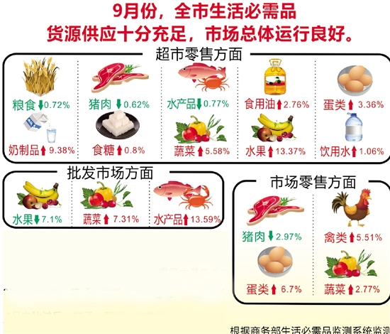 9月天气逐渐转凉,蔬菜生长速度加快,但受到“双节”对蔬菜需求量的提振,本月蔬菜价格以涨为主。10月秋高气爽的天气适合蔬菜生产,蔬菜上市量将持续增长,预计后期蔬菜整体价格呈现稳中趋跌的态势。水果批发价格有所回落。9月立秋过后,橘子、苹果、火龙果等大量应季水果放量上市,市场整体供大于求,价格开始小幅下跌。预计10月,大量应季水果供应量仍将处于高位,市场价格将呈稳中趋跌态势。