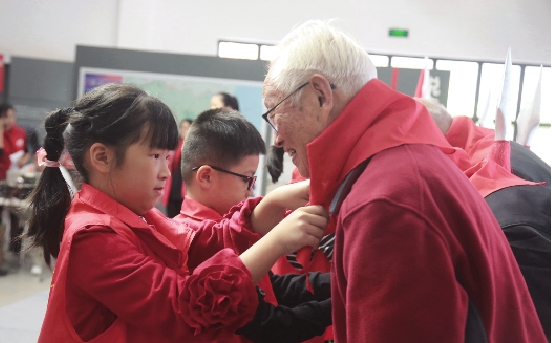 10月25日是重阳节,当天下午,在市青少年宫红领巾博物馆内举行的“醉美重阳”文明传习活动中,城东街道紫皋村丁福青、丁青富、丁梅增、丁国琪、丁友富、丁文志、丁玉法和陈香梅等8位新中国第一批少年儿童队员一出场,便引来了热烈掌声,少先队员们为他们戴上红领巾,奉上孝心茶。