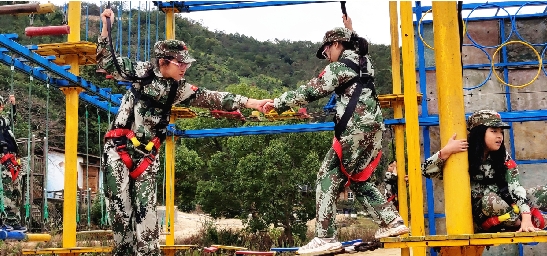 山巅之上,黄土之中,一群绿色的身影格外引人注目。那是学生们在体验“勇者之路”。勇者之路是部队400米障碍的简化版,几十米的路程有7个关卡,不仅考验力量和平衡,也考验勇气和协作。有的学生举重若轻,小心又稳当地跨越一个又一个障碍;有的学生越战越勇,一开始时小心翼翼,后来边走边对着拍照的老师摆造型;也有的学生被困在障碍中间不能前行。