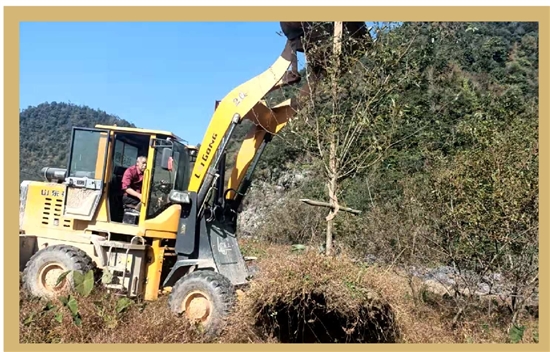 | 江西省婺源县浙源乡沱口村,挖掘机在拔除余桂英承包的荒废地上的树木,开垦成耕地。(余桂英提供) |