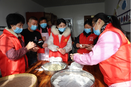 12月21日上午,松门镇胜盐村文化礼堂,志愿者在做冬至圆,并把做好的冬至圆送给村里的孤寡老人。