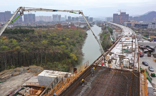 12月20日,台州市域铁路S1线横峰特大桥,建筑工人在浇筑最后一简箱梁混凝土。当天,全长3235米的横峰特大桥贯通。