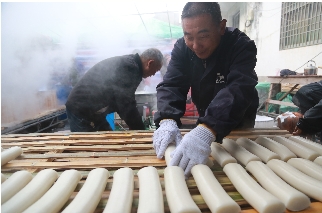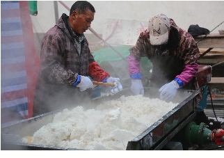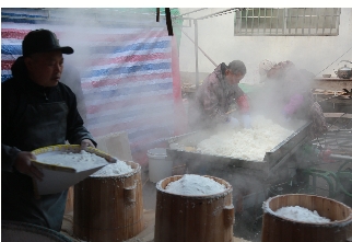 下张村做糕组是12月21日冬至日开始在紫皋村为村民做糕的,计划持续4天时间。在现场,紫皋村的村民忙着添米、扛糕、晾糕。一村民告诉记者,今年的加工费是100斤米66元。