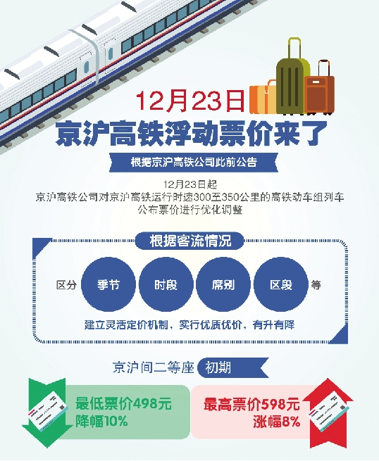 | 如今,乘坐高铁出行已成为许多人的首选。不过,“说走就走”的朋友要注意啦,京沪高铁自23日起对相关车次票价进行优化调整,开始实行浮动票价。 根据京沪高铁公司此前公告,23日起,京沪高铁公司对京沪高铁运行时速300至350公里的高铁动车组列车公布票价进行优化调整,改变目前固定票价的做法,根据客流情况,区分季节、时段、席别、区段等,建立灵活定价机制,实行优质优价,有升有降。 各站间执行票价将以公布票价为上限,实行多档次、灵活升降的票价体系,为旅客出行提供更多选择。京沪间二等座初期最低票价498元、降幅10%,最高票价598元、涨幅8%。 京沪高铁公司相关负责人介绍,2011年6月30日京沪高铁开通运营以来,客流运量大幅增长,平均客座率高位运行,九年多来始终执行单一票价,未能体现出产品结构的差异化和优质优价的原则,定价市场化程度不高。 该负责人表示,此次调整中票价有升有降。按照旅客对图定旅行时间、席别服务的不同需求合理调整票价,让广大旅客有更多的出行选择,同时体现优质优价,统筹考虑图定旅行时间和客座率等因素,合理安排列车票价档次。 |