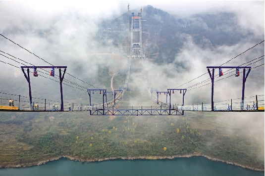 1月5日,在进行主缆架设的瓮开高速开州湖特大桥云雾环绕。