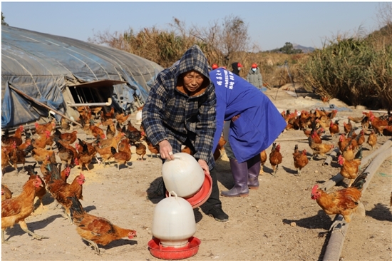 在松门镇长兴村潘家里山头,林梅香老人在养鸡场加水。