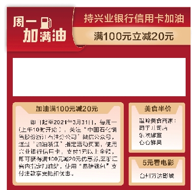近日,兴业银行推出加油满100元减20元的活动。拥有兴业银行信用卡的用户,每周一都可以享受在中石化加油,满100元立减20元的超值优惠。此外,兴业银行推出五折享美食活动,涵盖了温岭多个商家,如司乎吐司店、乐欧酵室、心心鲜果等。