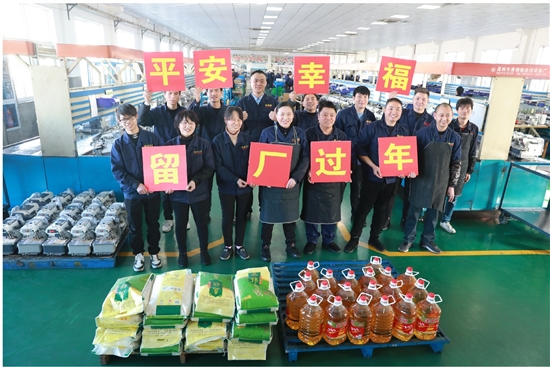 浙江美机缝纫机有限公司近500名外来员工中,90%以上决定春节不回家,留在厂里过个平安幸福年。昨天,当地工会组织为他们送上大米、油等生活物资。 记者 周学军摄