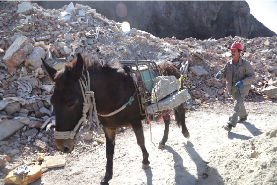 1月15日,松门镇远景居老虎山下玄真洞边,几名工人利用一支由6头骡子组成的骡队搬运石头等建筑材料上山。