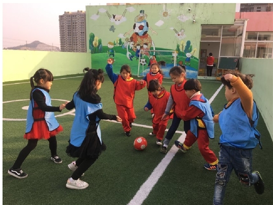 在幼儿园,每个孩子都有一个属于自己的足球。同时,学校保证每周一节足球课,每学期一次足球周活动,每两年开展一次足球嘉年华活动,给予课程实施定性的时间保障。
