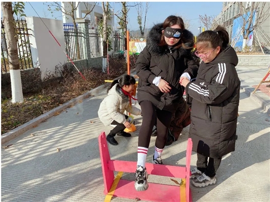 为了让学生有更深刻的体会,在“‘毅’起成长”闭幕式上,学校还设计了“见证成长”亲子体验游戏。在游戏中,家长全程戴着眼罩,由孩子牵着,完成“穿越雷区”“穿越火线”“翻山越岭”3个关卡。