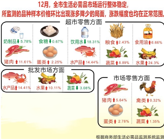 12月市内气温呈断崖式下跌,水果产量相对前期减少明显,同时受持续低温凝冻天气影响,水果的运输、储存等成本相对增加,导致水果价格上涨明显。随着天气逐渐变冷,水果产量相对前期减少,运输成本也相对增加,加上年底水果需求旺盛,高档水果礼盒将成为“香饽饽”,或将拉动水果价格持续上涨。冬季是猪肉销售旺季,市民对猪肉的消费需求明显增加,但临近元旦、春节,不少商家积极筹备节日货源,压栏惜售的现象大有存在,同时随着中南六省生猪禁运的出台,造成目前生猪市场供给持续乏力,猪肉价震荡走强。随着年底居民对腌制腊肉、香肠需求的增加,商家压栏惜售心态将愈发强烈,同时受寒潮、猪肉饲料成本增加等因素影响,猪肉零售价或将持续上涨。