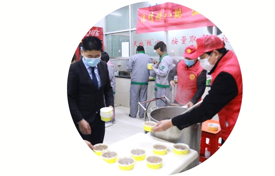 新河镇志愿者为工人们送上腊八粥。