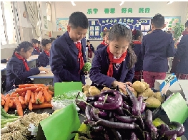 散学式上,邵玲燕共为学生准备了10 种蔬菜,分别是菠菜、土豆、番茄、卷心菜、盘菜、胡萝卜、茄子等。“这学期,学校倡导‘光盘行动’,我们班有很多‘光盘侠’,我也想趁机激励学生多吃蔬菜,了解蔬菜的‘前世今生’。”邵玲燕说,“同时,我也想让孩子走进厨房,体会长辈们做菜的辛苦,让家长分享孩子一学期丰收的果实。”