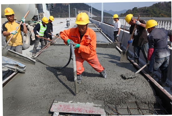 2月15日,杭绍台铁路温岭段泽国特大桥建设现场,工人正在浇筑无砟轨道底座板混凝土。