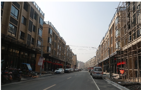 记者来到石夫人路,感觉这条路比以前宽了许多,双向两车道,路两边是城中村改造后的五层通天房屋,有的外面还架着竹制脚手架,有的却已装潢好,门口扎着红绸,写着“乔迁志禧”等字样。