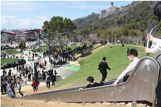 “这已经是我们第三次来到体育公园游玩了,孩子很喜欢这里。”正月初五这天,来自箬横的张先生一家再次来到公园,看着孩子在沙池里上蹿下跳、玩得不亦乐乎,夫妻俩不时拿出手机拍照,记录下这难得的亲子融洽共处时光。“箬横现在到市区开车仅需10分钟左右,方便快捷。而且这个公园有很多崭新的亲子活动项目,人气很旺,孩子一来就能玩大半天。”