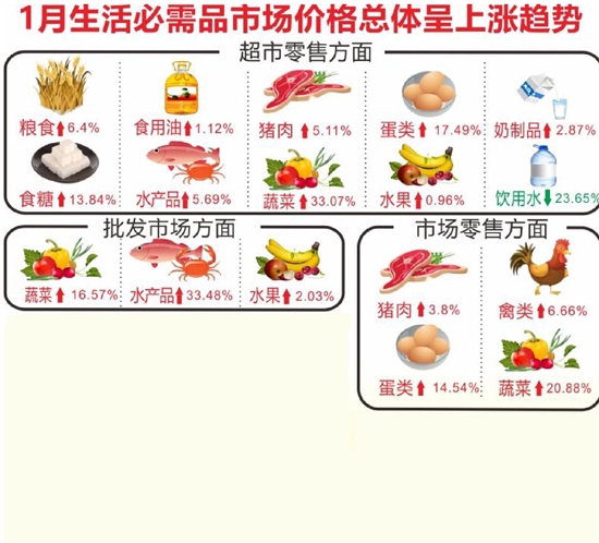 1月,寒潮天气频发,多地降雪,高速封闭或限行,生猪调运受阻,叠加冻肉制品新冠病毒阳性事件影响,进口冻猪肉流入速度减慢,生猪市场供应大幅缩减;因为春节期间猪肉终端消费需求上升,商家压栏惜售心态愈发强烈,叠加寒潮天气、高饲料成本、中南六省生猪禁运政策、进口冷链食品严控等不利因素,猪肉零售价持续上涨。蔬菜特别是叶菜类蔬菜生长周期被大幅拉长,成熟期延后,大棚蔬菜和露地菜产量持续下降;同时随着成品油价格的不断上行,山东、河北、福建等外地蔬菜储运成本也持续增加;加之冬季以来火锅消费需求偏强,而蔬菜是火锅的必备食材之一,供需失衡拉动蔬菜价格持续走高;春节是蔬菜的消费旺季,但也是蔬菜的供给淡季,加上雨雪降温等不确定因素影响,大棚蔬菜、外运蔬菜供应成本进一步增加,蔬菜整体供求矛盾会更加突出,蔬菜类特别是叶菜类价格或将持续上涨。