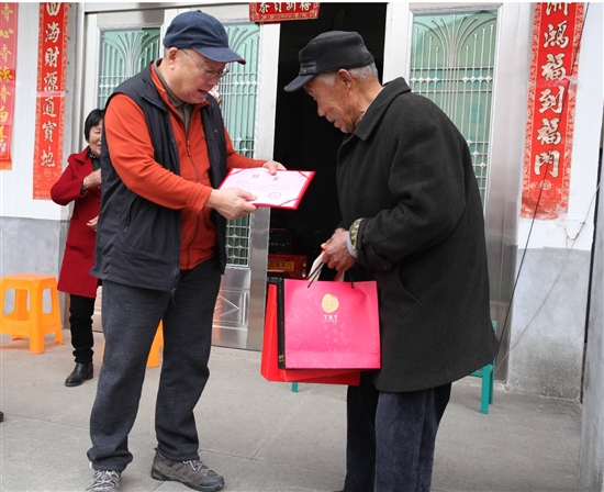 本报讯(记者刘振清文/图)2月25日,台州骨伤医院董事长章友棣和市慈善总会负责人专程赶赴大溪镇下陈村,将慰问品和一本鲜红的聘书交给许正富,聘请许正富为台州骨伤医院“道德导师”。