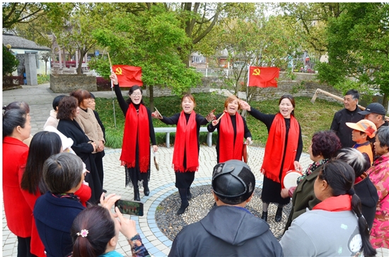 3月17日,在滨海镇新二塘庙村,由该镇文化礼堂艺术团组成的党员志愿者,以“三句半”的形式向村民们宣讲党史知识。