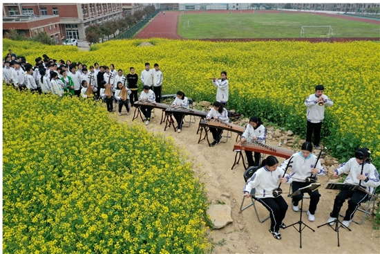 3月16日,温中实验初中艺术班的同学们正在学校旁的油菜花地里演奏古筝、琵琶、二胡、唢呐等乐器,奏响春天的旋律,吸引了不少同学驻足观赏。今年,该校在学校旁的山坡上种植了50亩左右的油菜花,眼下油菜花竞相开放,成为学校一道亮丽的风景。