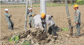 近日,东浦新塘,电力工人在田间架设农用电线杆。