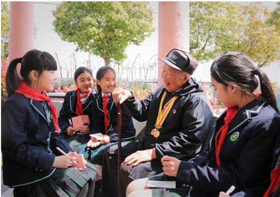 3月22日,在滨海镇海新村文化公园内,滨海小学的学生们通过听老兵讲党史、认党徽、绘党旗等形式,了解党的光辉历程。