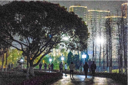 亮化升级后的九龙汇公园在灯光的点缀下显得璀璨多姿,成为周边市民休闲锻炼的好去处。记者走访看到,沿途灯光明亮,两旁树木上的灯带闪烁,将夜色衬托得别有韵味。前来赏景游园的市民络绎不绝,陪着老人、带着孩子或者邀三五好友,欣赏夜景、拍照合影……大家悠然自得,享受着晚间的闲暇时光。