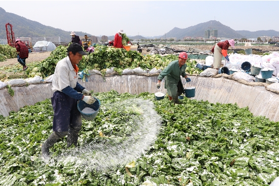 3月23日,位于石桥头镇土坦新村的腌菜场里一派忙碌的景象,50余名工人正将一车车运来的扁芥菜入坑腌制。