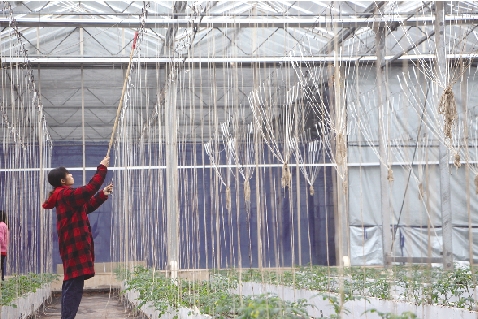 近日,在箬横镇星星曙光生态农业园区内,工人们正对即将进入爬藤期的“圣女果”进行吊绳作业。这里的“圣女果”采用无土栽培技术,依托“智慧果园”,对生产资料投入、病虫害防治等进行监测。目前,园区内“圣女果”种植面积达6600余平方米,共3万多株。
