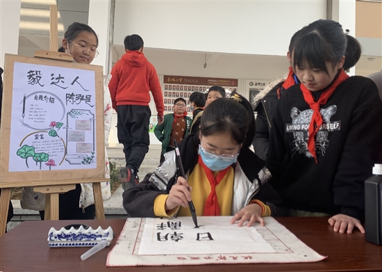 在陈一翰摊位的斜对面,围满了学生,那是六(2)班陈泓邑在教授同学书法。只见她温言暖语地指导着同学,颇有小老师的风范。上个学期,陈泓邑选择了书法、舞蹈和国画作为自己的打卡自选项目。每天晚上,作业完成后,她都要花费两个小时在打卡项目上。有时候作业完成得迟了,陈泓邑也想过放弃打卡,但是集齐“小毅达人秀”徽章的想法深深地扎根在她的脑海中,催促着她继续完成任务。她透露,自从参与了打卡,家里“鸡飞狗跳”的现象变少了,母慈子孝的场景变多了。“现在不用妈妈催,我会自觉地开始练习,不像以前总要爸爸妈妈三催四请,而且我更加耐得住性子,能老实地坐在凳子上完成每项任务。”