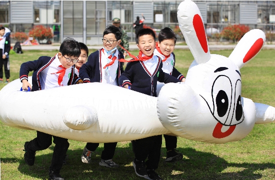 3月25日,大溪镇第二小学的师生在温岭曙光生态农业园春游,做龟兔赛跑、毛毛虫、动力圏等游戏。